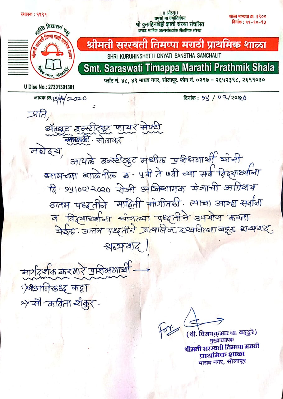 Acute Institute of Fire & Safety Solapur branch has completed fire & safety training session to school kids & staff at Smt. Saraswati Timappa Prathmik Shala Solapur. Session was really good & we know students & staff is feeling great by the knowledge of fire & its safety. We are very much thankful to Principal Mr. V. B. Baddure sir & school staff for giving us this opportunity.